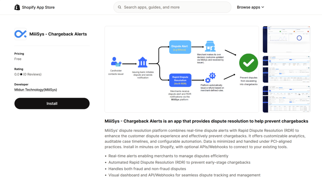 米盾MiiiSys宣布正式加入Shopify 合作伙伴计划(Shopify Partner Program),并发布「MiiiSys – Chargeback Alerts」应用,现已在Shopify App Store上线,面向全球Shopify 商家提供争议解决(拒付预警)服务。该应用覆盖非欺诈争议(如收货问题、服务不符等)与欺诈争议(如盗刷、异常交易),并通过在“发起拒付之前”完成订单干预与快速解决,帮助商家降低拒付率与营收损失、提升运营效率。