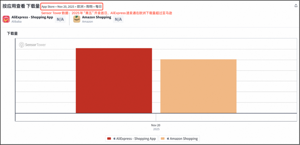 每年“黑色星期五”都是欧美消费者最重要的购物狂欢节之一,也是亚马逊全年最关键的销售战役和核心主场,但今年这一局面被打破——据知名应用分析平台Sensor Tower数据,2025年“黑五”开卖首日(11月20日),阿里巴巴旗下跨境电商平台速卖通AliExpress在欧洲下载量超过亚马逊。业内人士指出,作为电商“出海四小龙”中唯一能在品牌出海赛道与亚马逊正面竞争的平台,“黑五”在欧洲实现下载量反超,标志着速卖通开始向亚马逊的核心主场发起挑战。